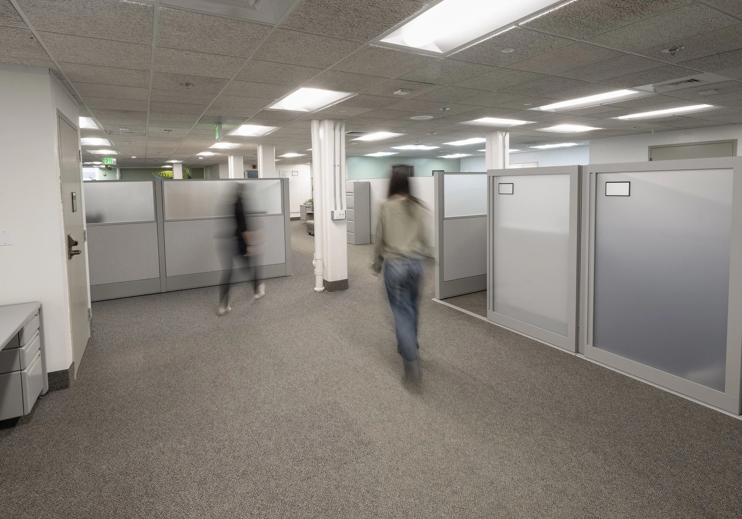 The final layout includes five private offices, two of which are larger to accommodate meetings. The suite was planned to support a total of 17 staff members, with a mix of private offices, cubicles, and a staffed public counter. A lockable safe closet was also incorporated into the design.